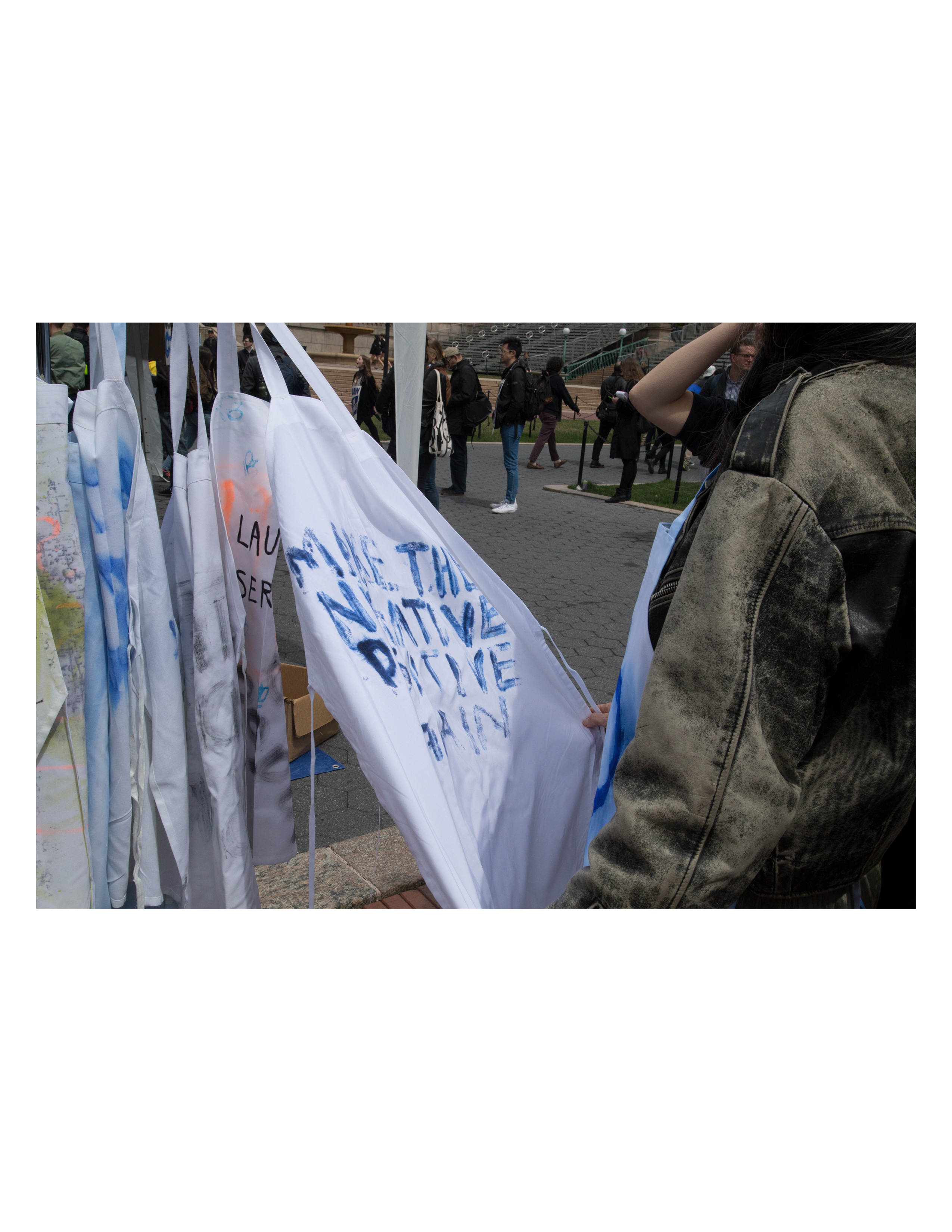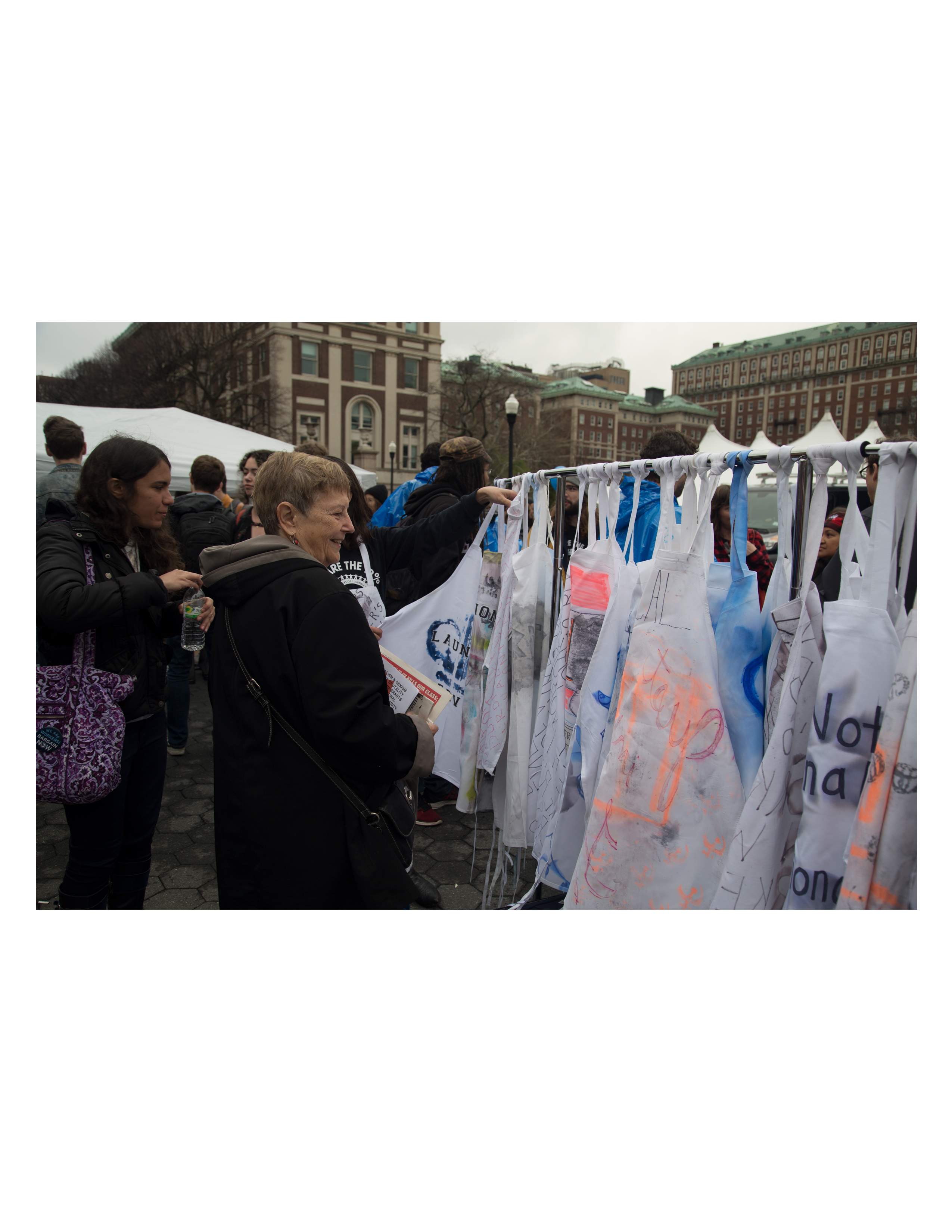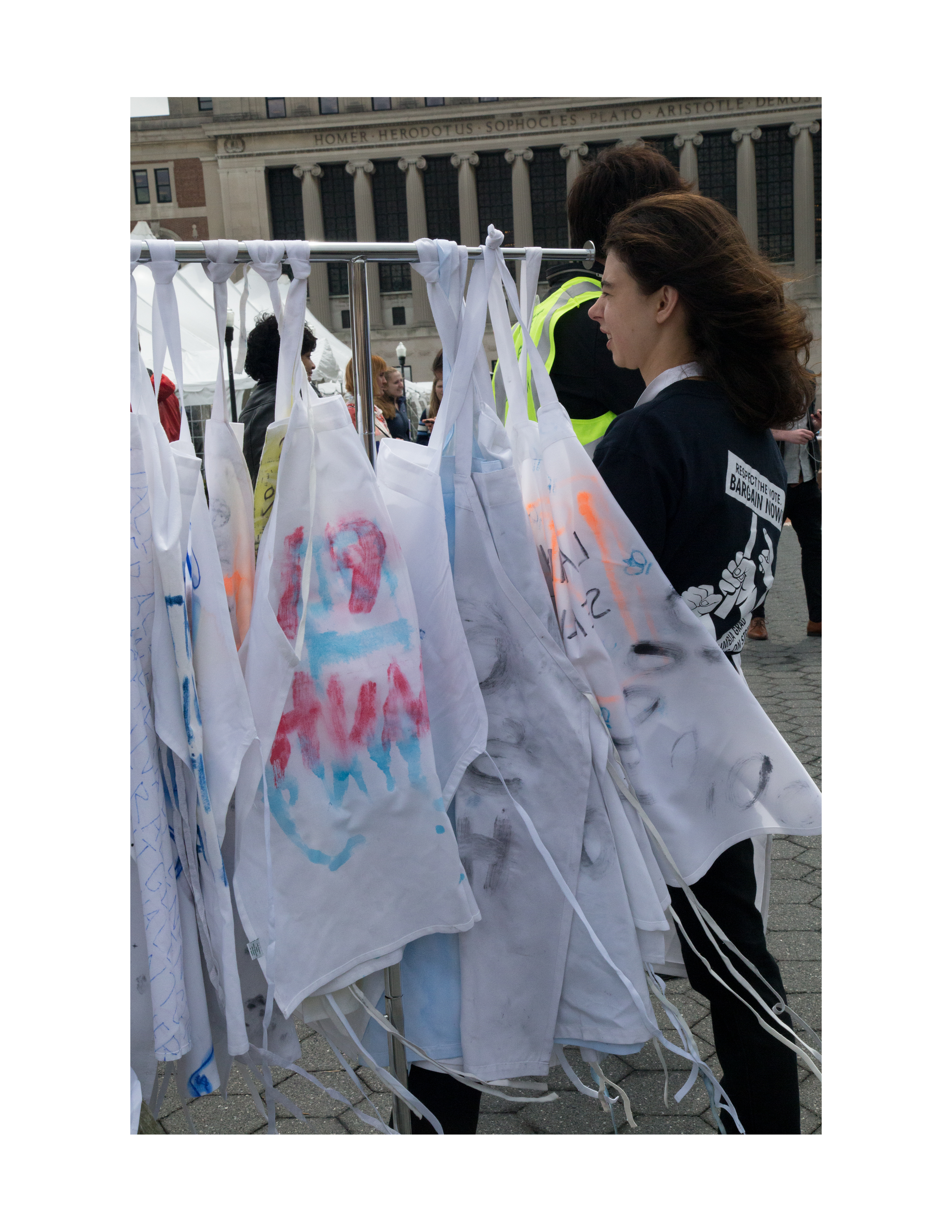 2018 Protest intervention ft 68 wearable aprons, each with a slogan from "left field", for the first Columbia University Graduate Student-Teacher Strikes.