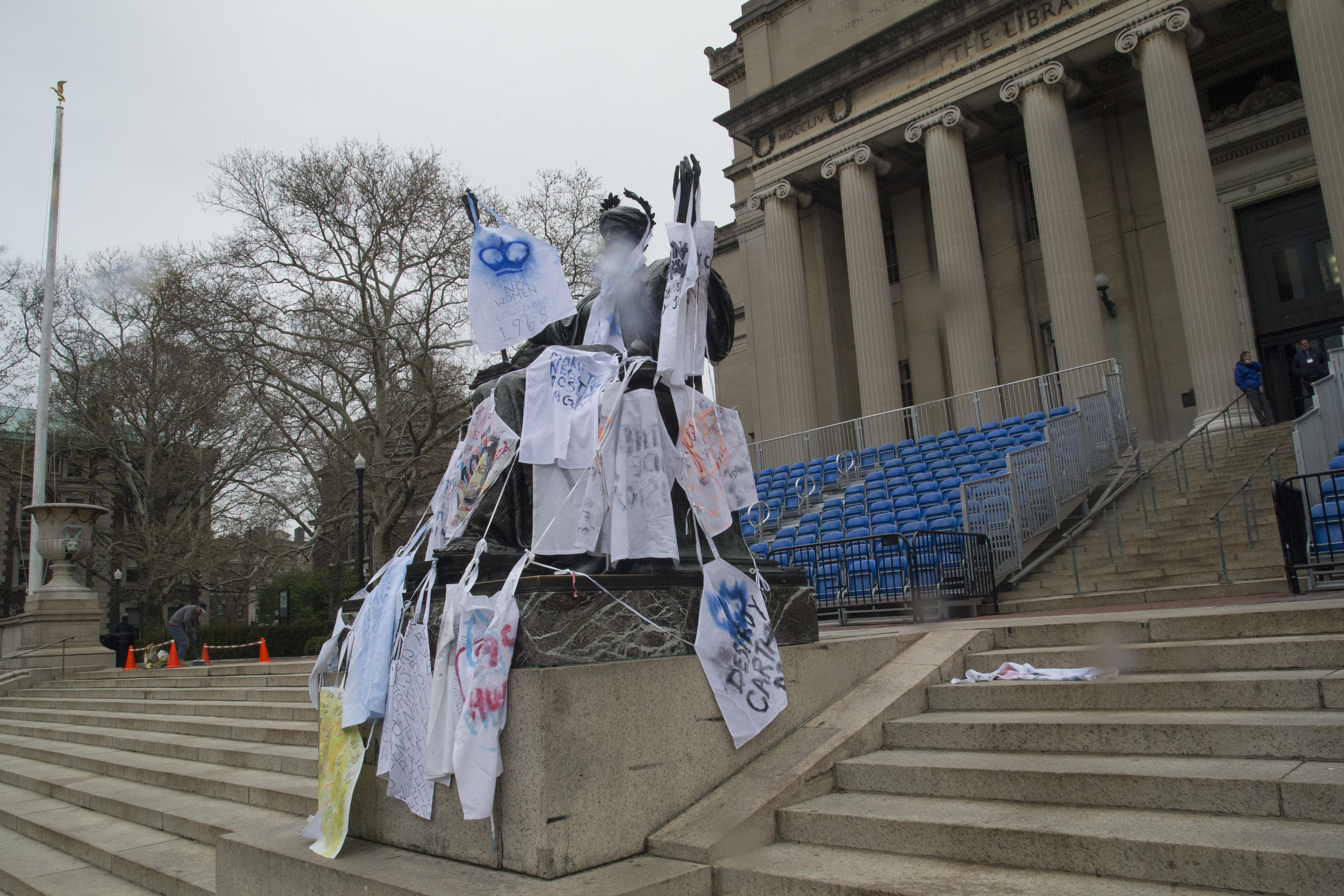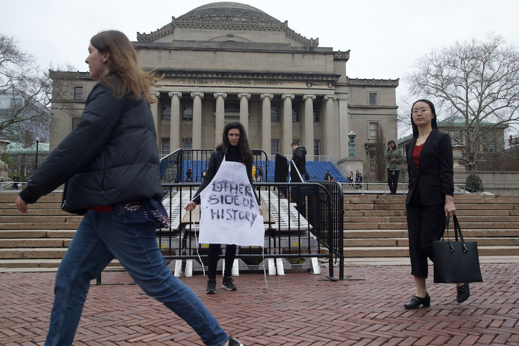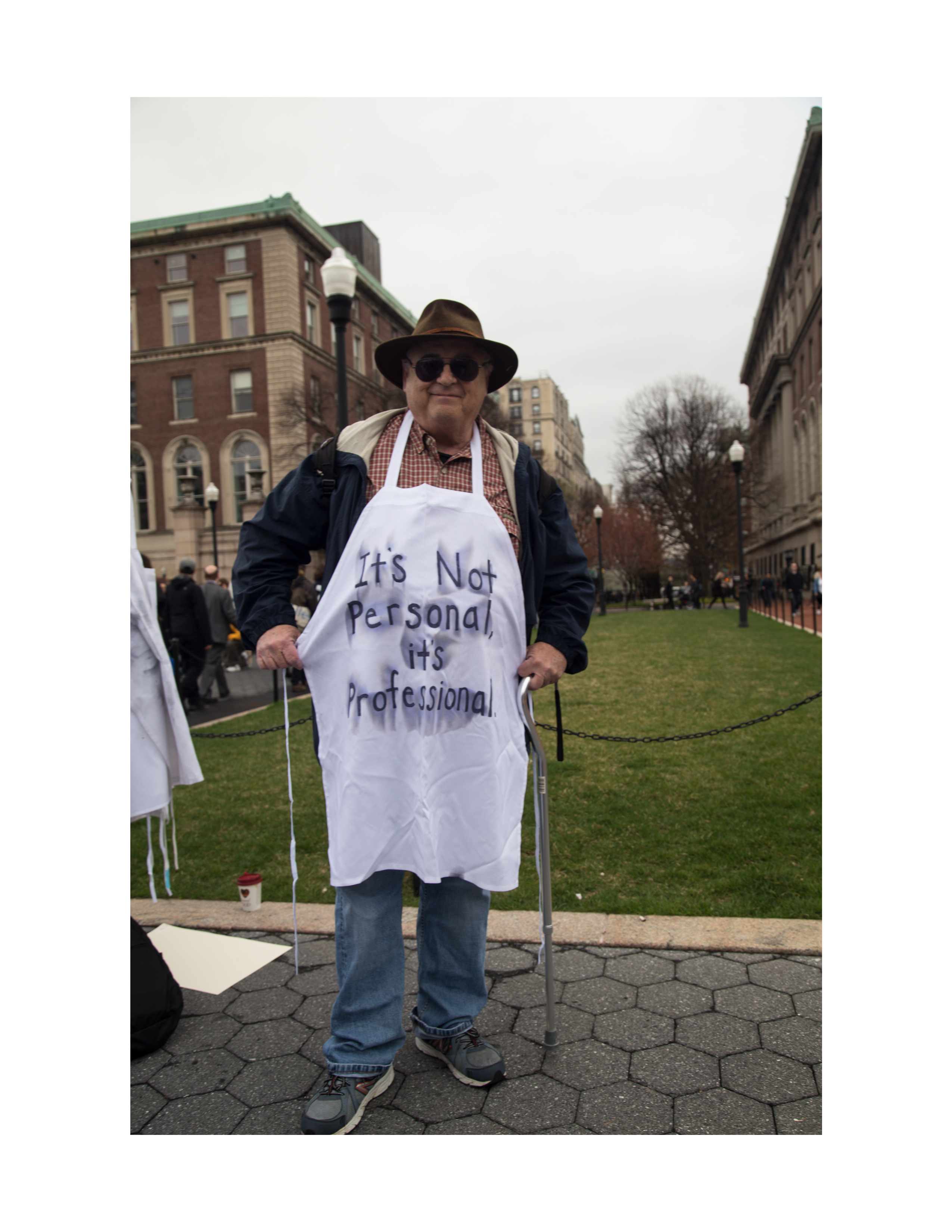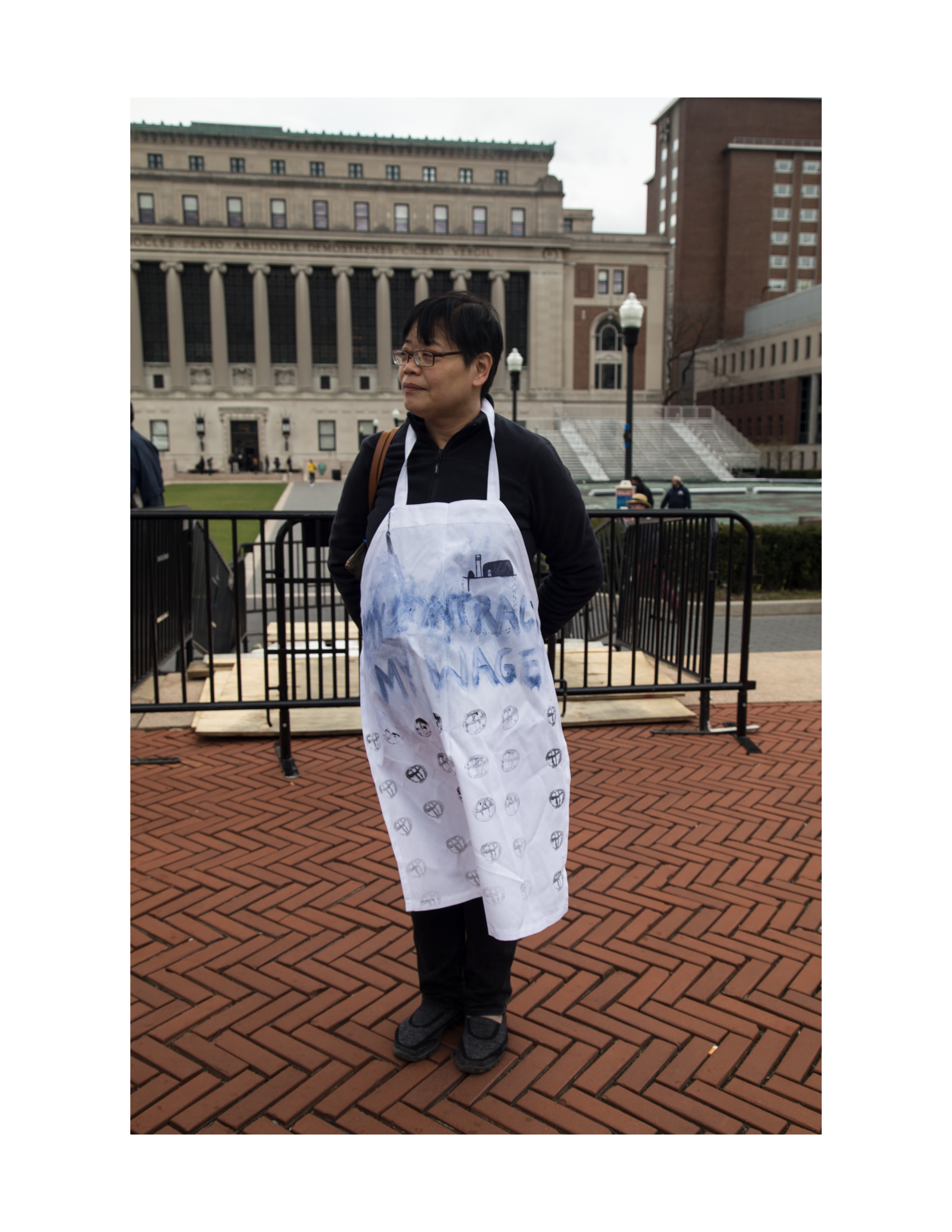 2018 Protest intervention ft 68 wearable aprons, each with a slogan from "left field", for the first Columbia University Graduate Student-Teacher Strikes.